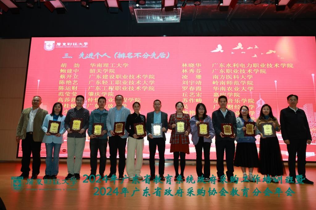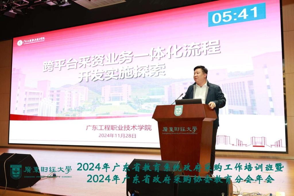 在本次会议上,我校取得重大历史突破,学校首次获评“2024年度高校采购工作先进集体”、管理服务创新成果二等奖,陈运财获评“2024年度高校采购工作先进个人”三项殊荣,也是我省本年度唯一一所同时获得以上荣誉的高职院校。与此同时,我校受广东省政府采购协会教育分会邀请,以《跨平台采资业务一体化流程开发实施探索》为主题,在大会上分享了我校在政府采购领域的有效做法与先进工作经验。