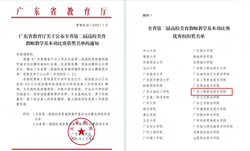 近日,广东省教育厅发布了关于公布全省第二届高校美育教师教学基本功比赛获奖名单的通知(粤教体函〔2025〕1号)。我校艺术设计学院教师施焦、温洁芸、徐谌榕、李源雨获得一等奖,邓秀兰、黄千、郑玲玲老师获得二等奖,陈菁晖老师获得三等奖,共8项省级奖项。学校被授予优秀组织奖。