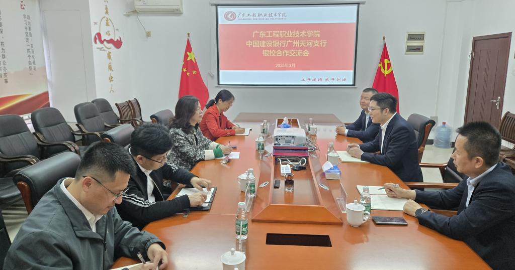 2025年3月4日上午,中国建设银行广州天河支行牟泉如副行长一行来校交流,我校党委委员、党委副书记方燕在广州校区接待了牟行一行。双方就开展银校合作有关事项展开交流,共商银校合作、共建学校信息化,同心同行,助力学校高质量发展。财务部和现代教育技术中心相关人员参加本次交流会。