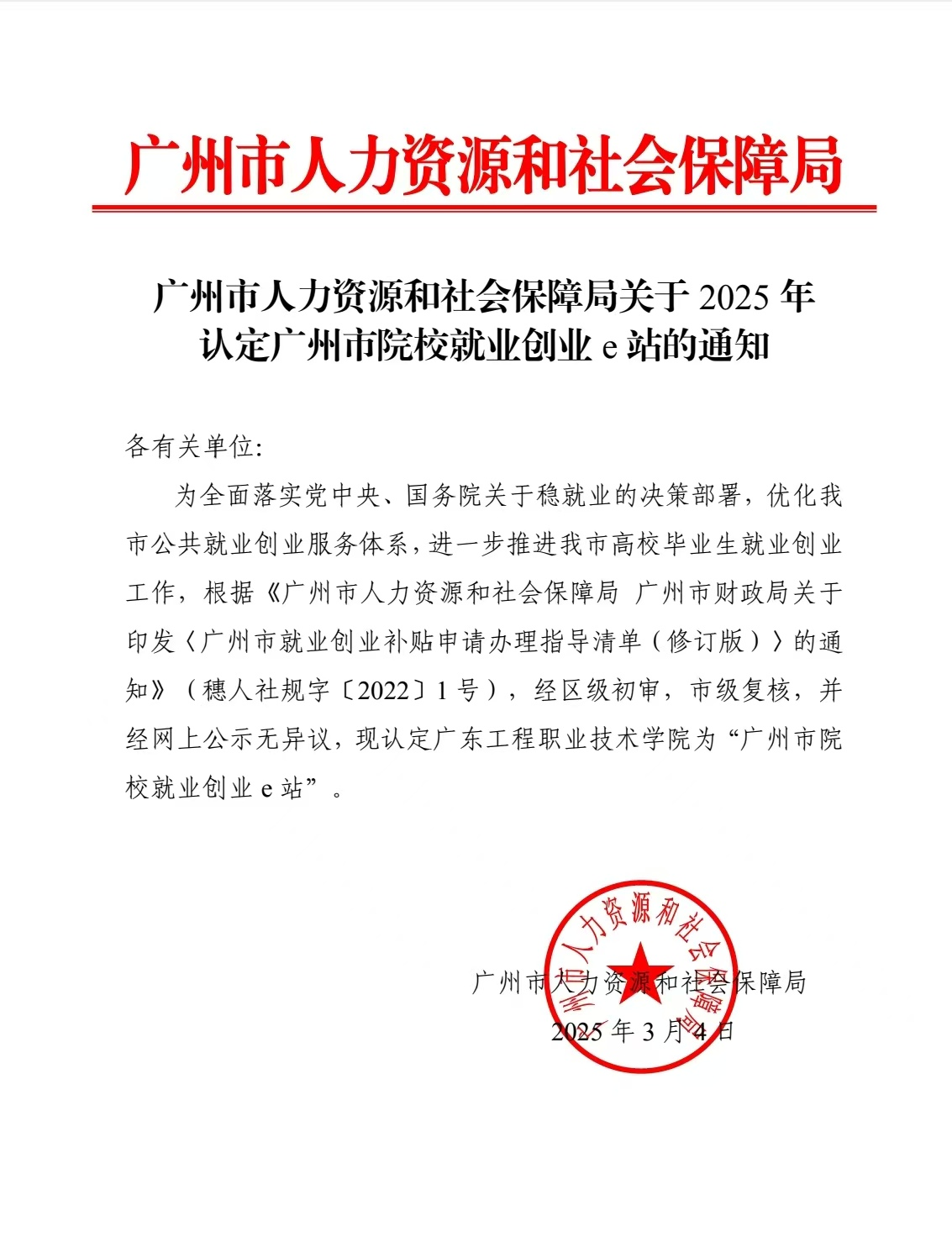近日,广州市人力资源和社会保障局发布了2025年认定广州市院校就业创业e站的通知,学校作为此次唯一一所院校获批立项建设,学校三年内将分三次获得30万元(首次5万元,第二次10万元,第三次15万元)的资助。(文/图:尹国胜,校对:何杰文,审核:黎惠生)