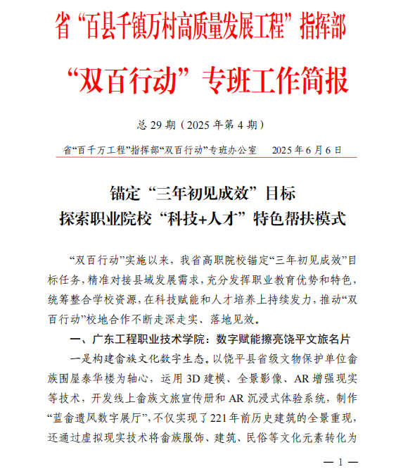 2025年6月6日,我校帮扶工作案例成功入选广东省“百县千镇万村高质量发展工程”指挥部发布的《“双百行动”专班工作简报》总29期(2025年第4期)。