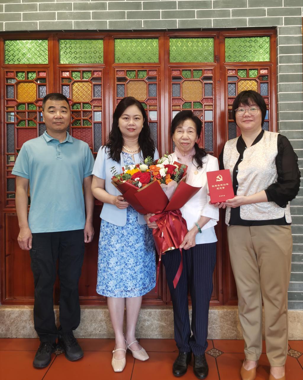 在中国共产党成立104周年之际,党中央为党龄达到50年、一贯表现良好的党员颁发“光荣在党50年”纪念章,我校退休老党员黎秋华同志获此殊荣。