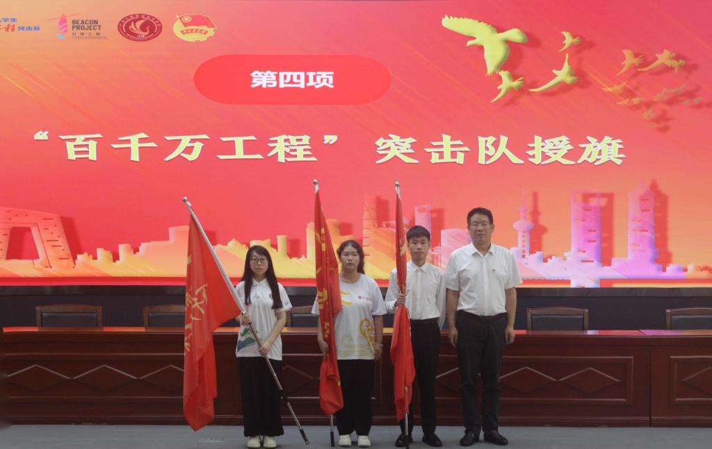 在观看2024年社会实践视频剪影后,校团委书记刘山发就2025年暑期社会实践重点项目进行部署,从推普助力乡村振兴、省级重点团队打磨、社会实践如何与共青团科创比赛相结合等多方面进行了解读与指导。随后进行了突击队校级重点队伍授旗仪式,张永强副校长为3个优秀突击队代表进行授旗。学生代表进行了表态发言,号召大家在火热的实践中,勇担重任、冲锋在前,争当排头兵、生力军。