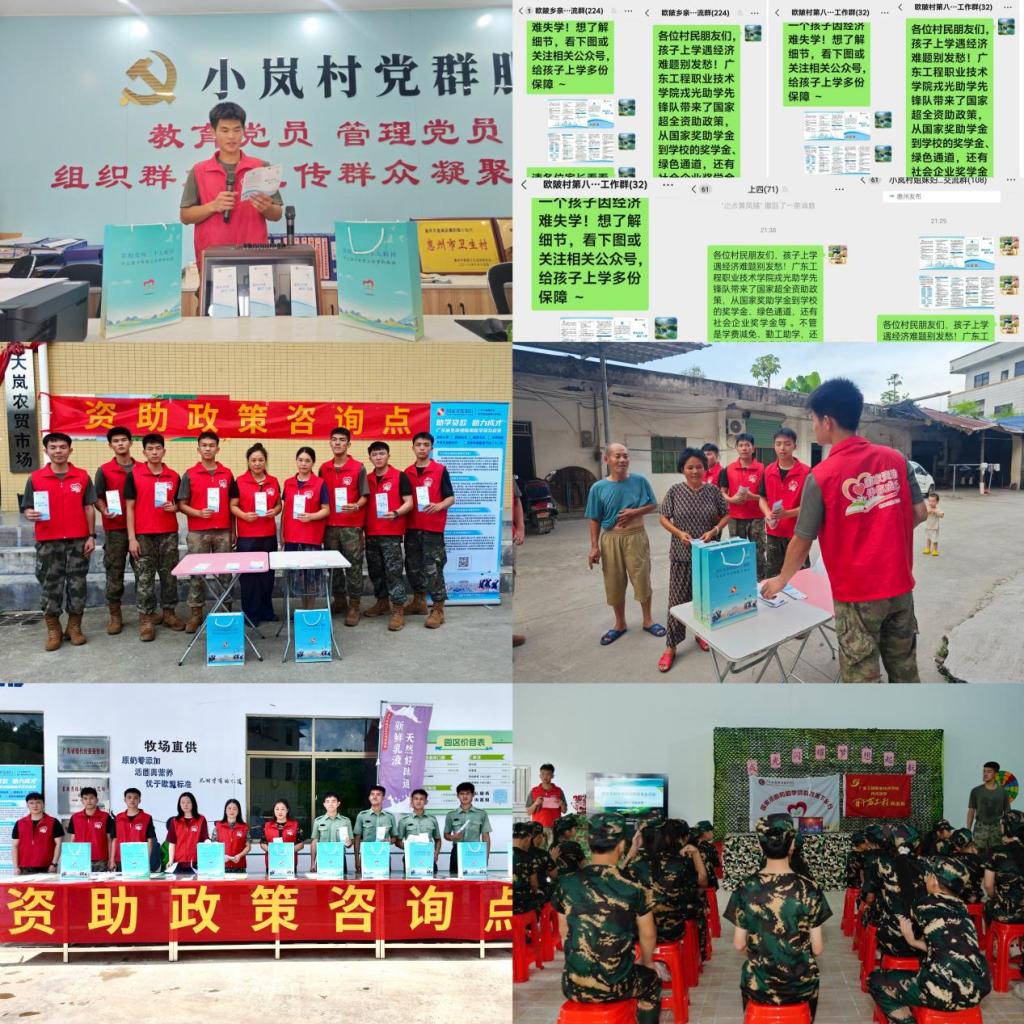 为全面贯彻落实党的二十大“完善覆盖全学段学生资助体系”的部署要求,推动国家学生资助及退役军人上学资助政策精准落地乡村,广东工程职业技术学院组建了一支以在校退役大学生士兵为主力的“戎光筑梦”退役军人资助政策宣传专项团队。7月10日至16日,在学校学生工作部(招生与就业指导中心)张文婷、艺术设计学院杨容两位老师的带领下,以“退伍不褪色,乡土建新功”的誓言,开赴惠州市惠阳区横沥镇,化身暖心政策“宣传队”和“播种机”,将国家针对贫困家庭学子与退役军人的各项资助关怀,化作一场场浸润心田的“政策及时雨”,精准送达田间地头、农家小院和百姓心坎。