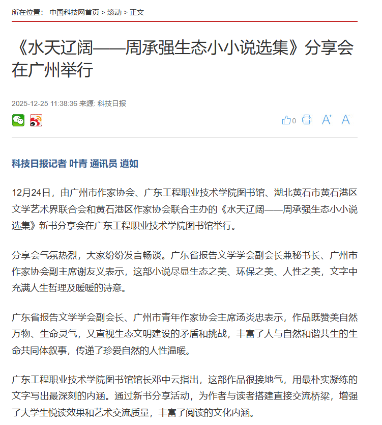 12月24日,由广州市作家协会、广东工程职业技术学院图书馆、湖北黄石市黄石港区文学艺术界联合会和黄石港区作家协会联合主办的《水天辽阔——周承强生态小小说选集》新书分享会在广东工程职业技术学院图书馆举行。
