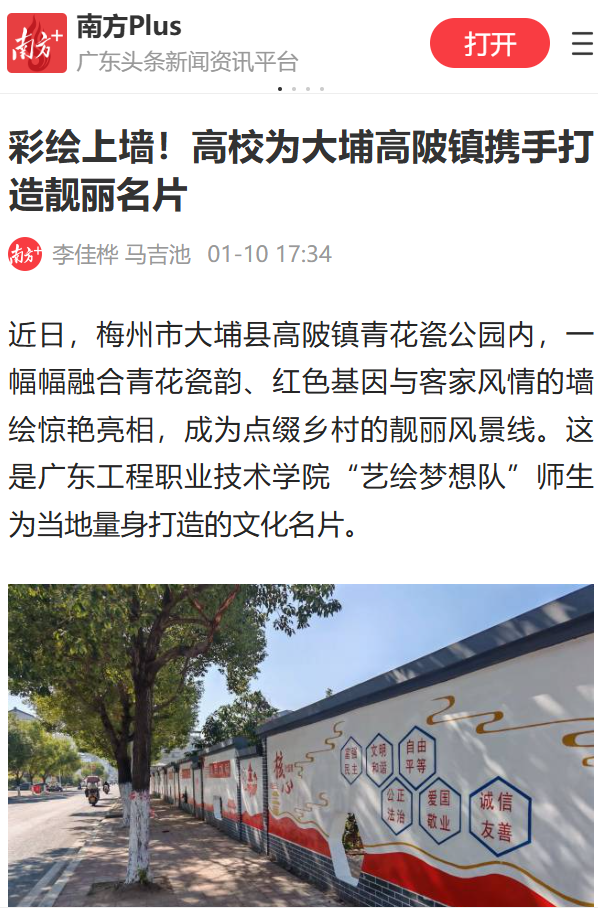 近日,梅州市大埔县高陂镇青花瓷公园内,一幅幅融合青花瓷韵、红色基因与客家风情的墙绘惊艳亮相,成为点缀乡村的靓丽风景线。这是广东工程职业技术学院“艺绘梦想队”师生为当地量身打造的文化名片。