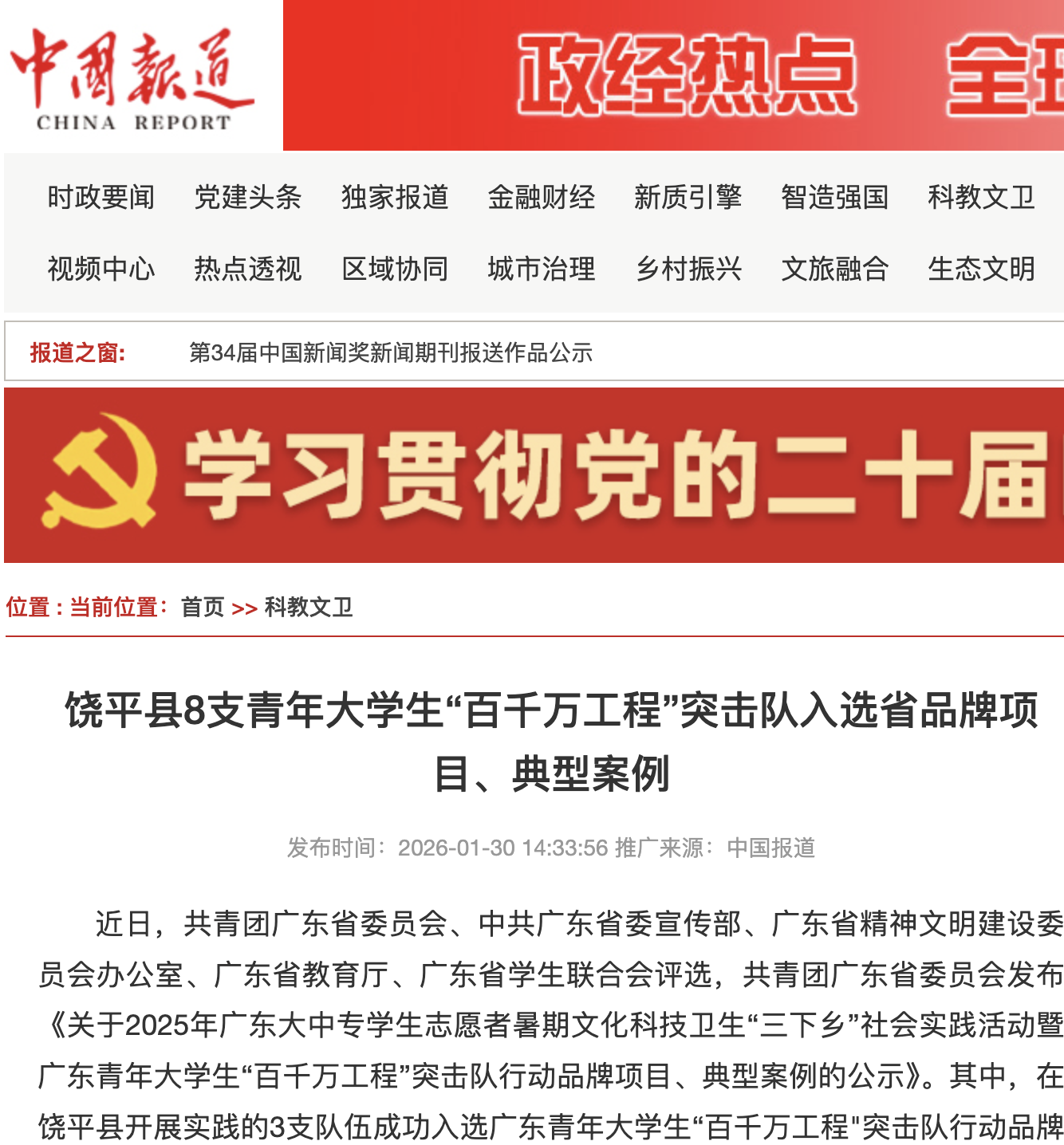 近日,共青团广东省委员会、中共广东省委宣传部、广东省精神文明建设委员会办公室、广东省教育厅、广东省学生联合会评选,共青团广东省委员会发布《关于2025年广东大中专学生志愿者暑期文化科技卫生“三下乡”社会实践活动暨广东青年大学生“百千万工程”突击队行动品牌项目、典型案例的公示》。其中,在饶平县开展实践的3支队伍成功入选广东青年大学生“百千万工程"突击队行动品牌项目,5支队伍成功入选广东青年大学生“百千万工程”突击队行动典型案例,以扎实实绩彰显青春担当。
