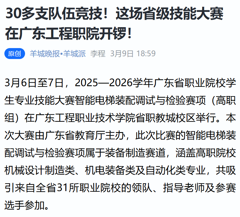 3月6日至7日,2025—2026学年广东省职业院校学生专业技能大赛智能电梯装配调试与检验赛项(高职组)在广东工程职业技术学院省职教城校区举行。本次大赛由广东省教育厅主办,此次比赛的智能电梯装配调试与检验赛项属于装备制造赛道,涵盖高职院校机械设计制造类、机电装备类及自动化类专业,共吸引来自全省31所职业院校的领队、指导老师及参赛选手参加。