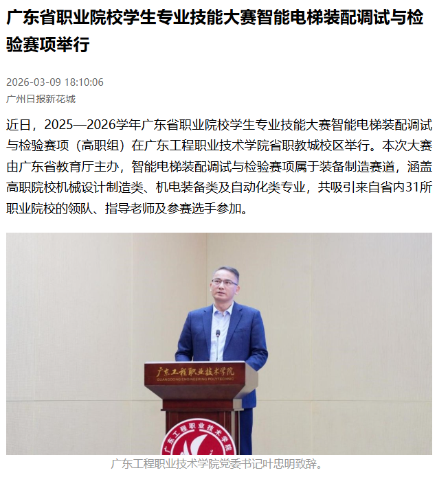 近日,2025—2026学年广东省职业院校学生专业技能大赛智能电梯装配调试与检验赛项(高职组)在广东工程职业技术学院省职教城校区举行。本次大赛由广东省教育厅主办,智能电梯装配调试与检验赛项属于装备制造赛道,涵盖高职院校机械设计制造类、机电装备类及自动化类专业,共吸引来自省内31所职业院校的领队、指导老师及参赛选手参加。