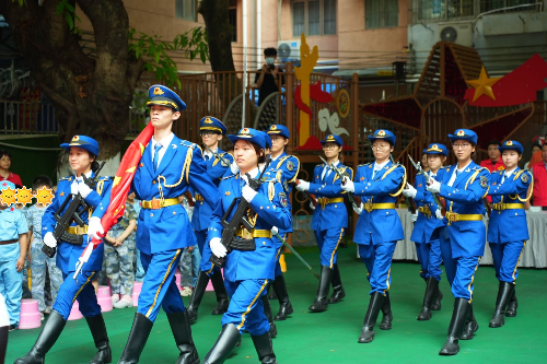 活动在庄严的升旗仪式中开始。广东工程职业技术学院国旗护卫队步伐铿锵,护送国旗入场。全体师生肃立行礼,注视五星红旗冉冉升起。孩子们在庄严氛围中感受国旗的神圣与军人纪律的力量,爱国情怀在心中悄然生根、慢慢发芽。此次升旗仪式,同时也是天河区退役军人事务局创新国防教育模式的一次实践。通过搭建“高校 — 幼儿园”联动平台,精心培育“小手拉大手 —— 小小国旗护卫队”特色项目,让高校国旗队队员与孩子们结对,手把手带他们认识国旗、学习礼仪,在“玩”中学,在“学”中爱。
