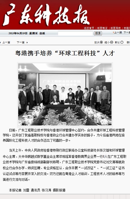 4月19日,《广东科技报》在三版重要位置就我院与香港环球管理学院合作办学成立广东工程环球学院、积极开展粤港校际合作等办学实践作了图文并茂的报道。南方网全文转载了相关报道。