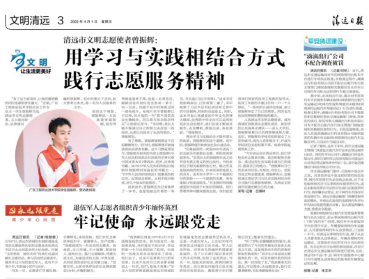 在这种培养氛围下,社会工作专业学生曾振辉秉承“助人自助”的专业工作理念,积极投身于校内校外的志愿者活动中,通过运用自己的所学专业知识,开展社会实践活动。在清远日报的报道中,曾振辉也深刻认识到,理论学习与实践结合才能有更大的收获,在入选清远市文明志愿使者,成为清城区首批普法志愿队成员后,表示将继续秉持专业工作素质、热情和奉献精神,积极投身于社会实践中。