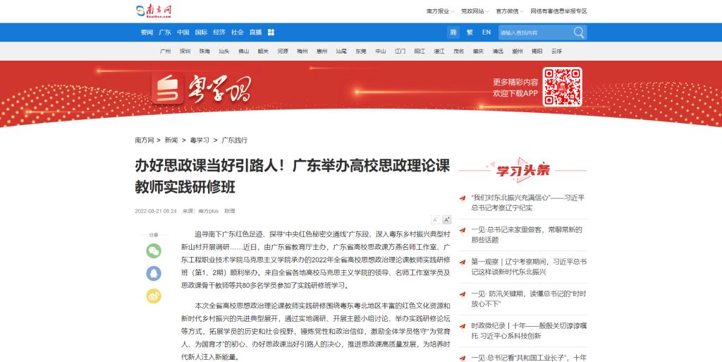 追寻南下广东红色足迹、探寻“中央红色秘密交通线”广东段、深入粤东乡村振兴典型村新山村开展调研……近日,由广东省教育厅主办,广东省高校思政课方燕名师工作室、广东工程职业技术学院马克思主义学院承办的2022年全省高校思想政治理论课教师实践研修班(第1、2期)顺利举办。来自全省各地高校马克思主义学院的领导、名师工作室学员及思政课骨干教师等共80多名学员参加了实践研修班学习。