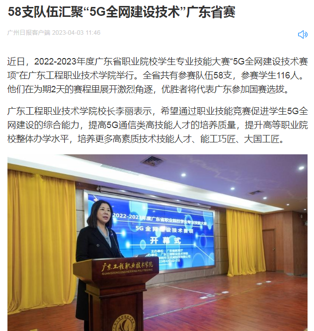 广东工程职业技术学院校长李丽表示,希望通过职业技能竞赛促进学生5G全网建设的综合能力,提高5G通信类高技能人才的培养质量,提升高等职业院校整体办学水平,培养更多高素质技术技能人才、能工巧匠、大国工匠。