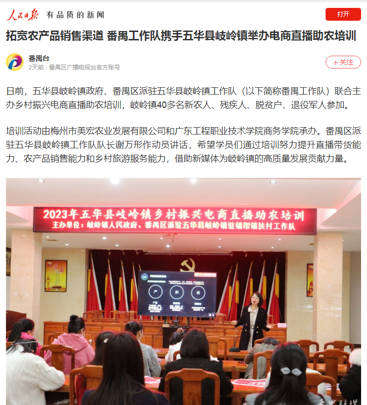 培训活动由梅州市美宏农业发展有限公司和广东工程职业技术学院商务学院承办。番禺区派驻五华县岐岭镇工作队队长谢万形作动员讲话,希望学员们通过培训努力提升直播带货能力、农产品销售能力和乡村旅游服务能力,借助新媒体为岐岭镇的高质量发展贡献力量。