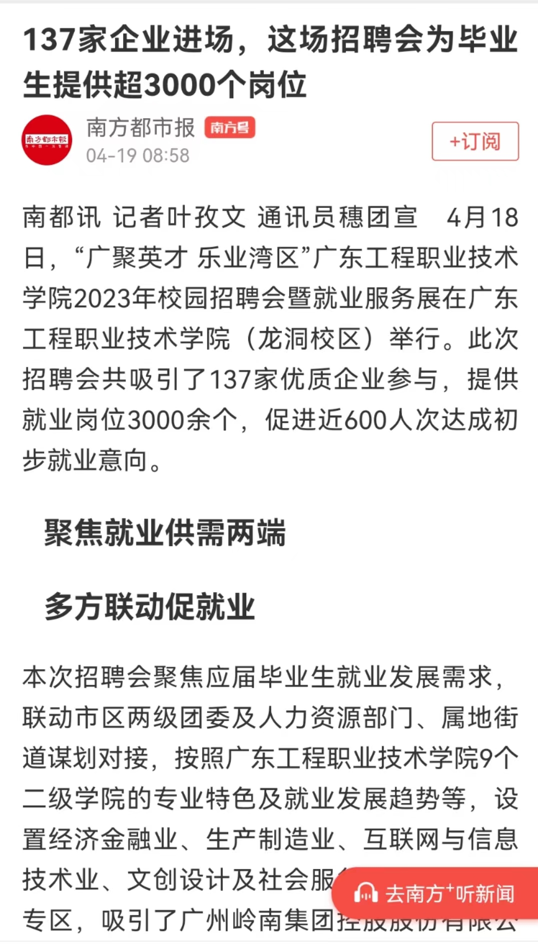 4月18日,“广聚英才 乐业湾区”广东工程职业技术学院2023年校园招聘会暨就业服务展在广东工程职业技术学院(龙洞校区)举行。此次招聘会共吸引了137家优质企业参与,提供就业岗位3000余个,促进近600人次达成初步就业意向。