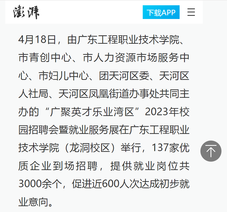 4月18日,由广东工程职业技术学院、市青创中心、市人力资源市场服务中心、市妇儿中心、团天河区委、天河区人社局、天河区凤凰街道办事处共同主办的“广聚英才乐业湾区”2023年校园招聘会暨就业服务展在广东工程职业技术学院(龙洞校区)举行,137家优质企业到场招聘,提供就业岗位共3000余个,促进近600人次达成初步就业意向。