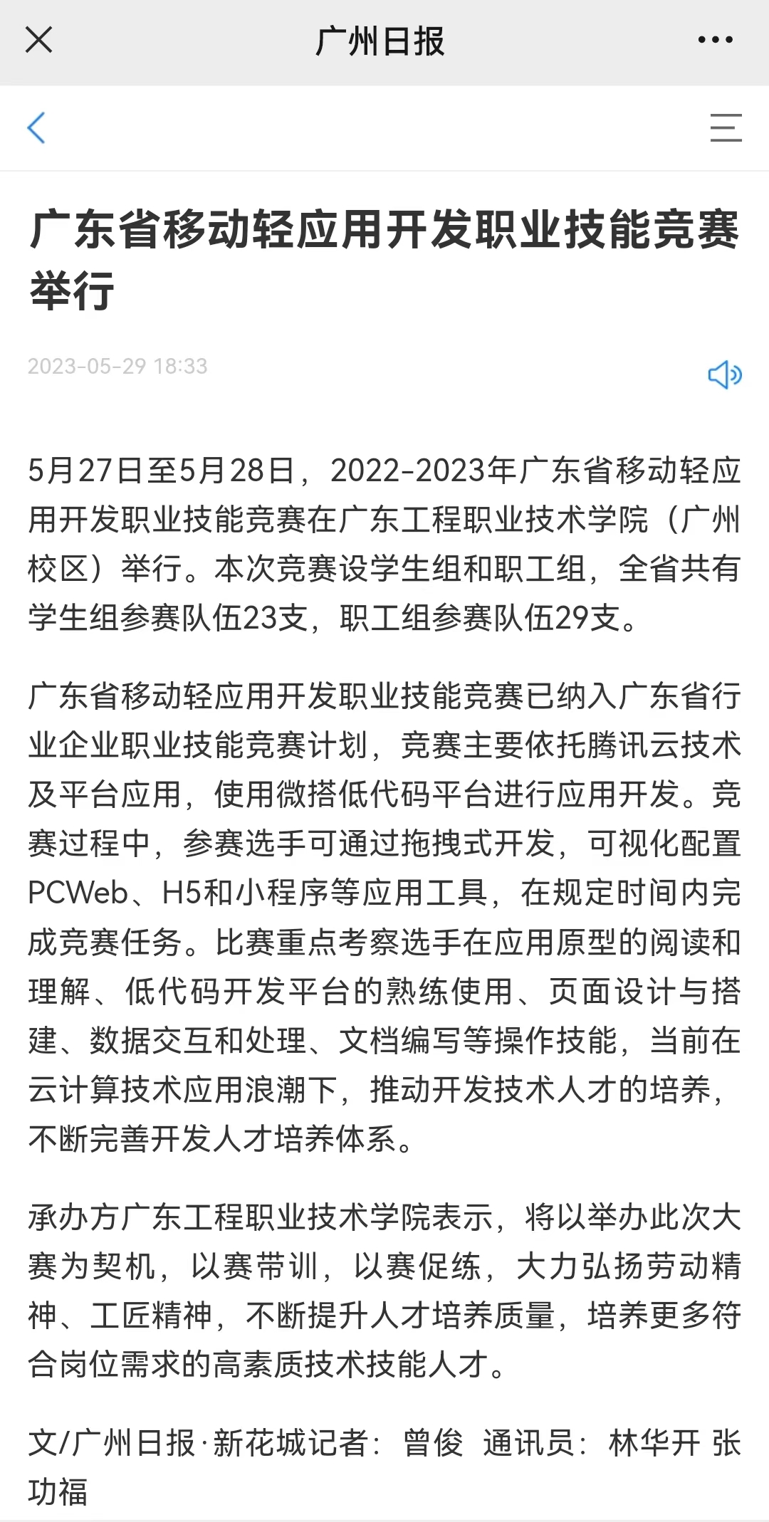 5月27日至5月28日,2022-2023年广东省移动轻应用开发职业技能竞赛在广东工程职业技术学院(广州校区)举行。本次竞赛设学生组和职工组,全省共有学生组参赛队伍23支,职工组参赛队伍29支。