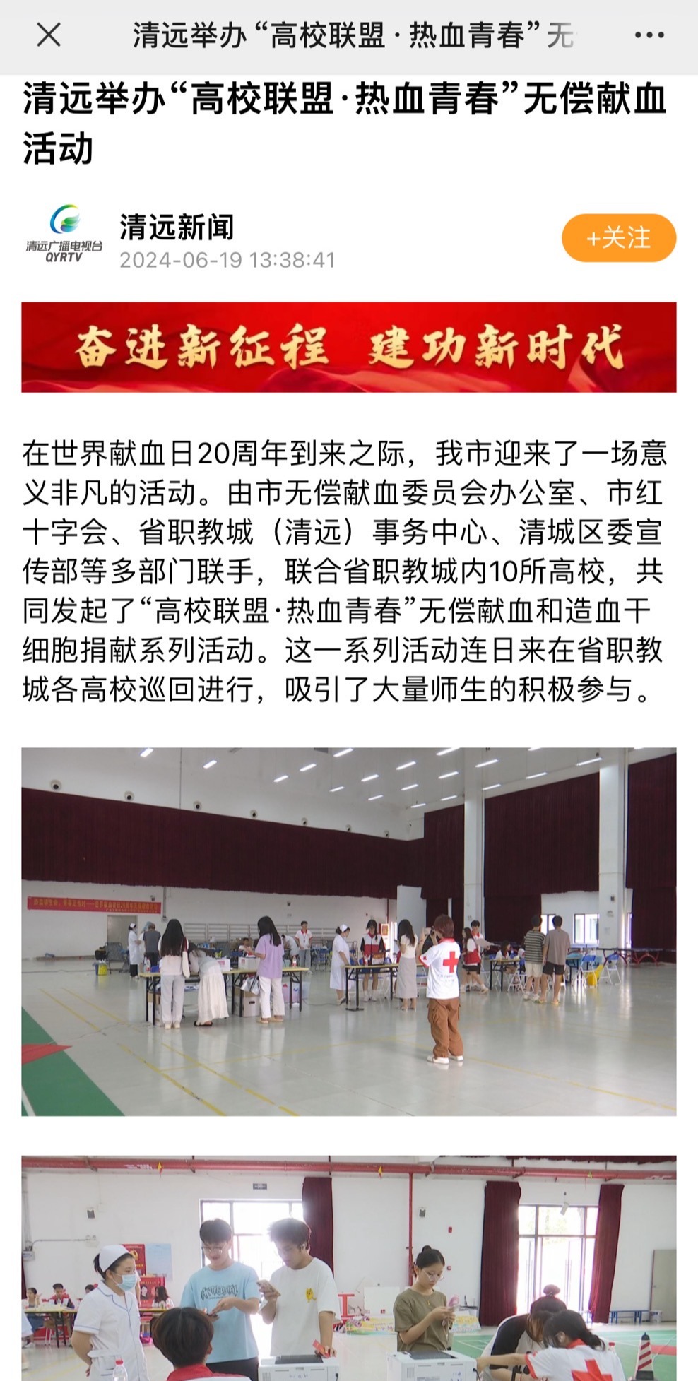 在世界献血日20周年到来之际,我市迎来了一场意义非凡的活动。由市无偿献血委员会办公室、市红十字会、省职教城(清远)事务中心、清城区委宣传部等多部门联手,联合省职教城内10所高校,共同发起了“高校联盟·热血青春”无偿献血和造血干细胞捐献系列活动。这一系列活动连日来在省职教城各高校巡回进行,吸引了大量师生的积极参与。