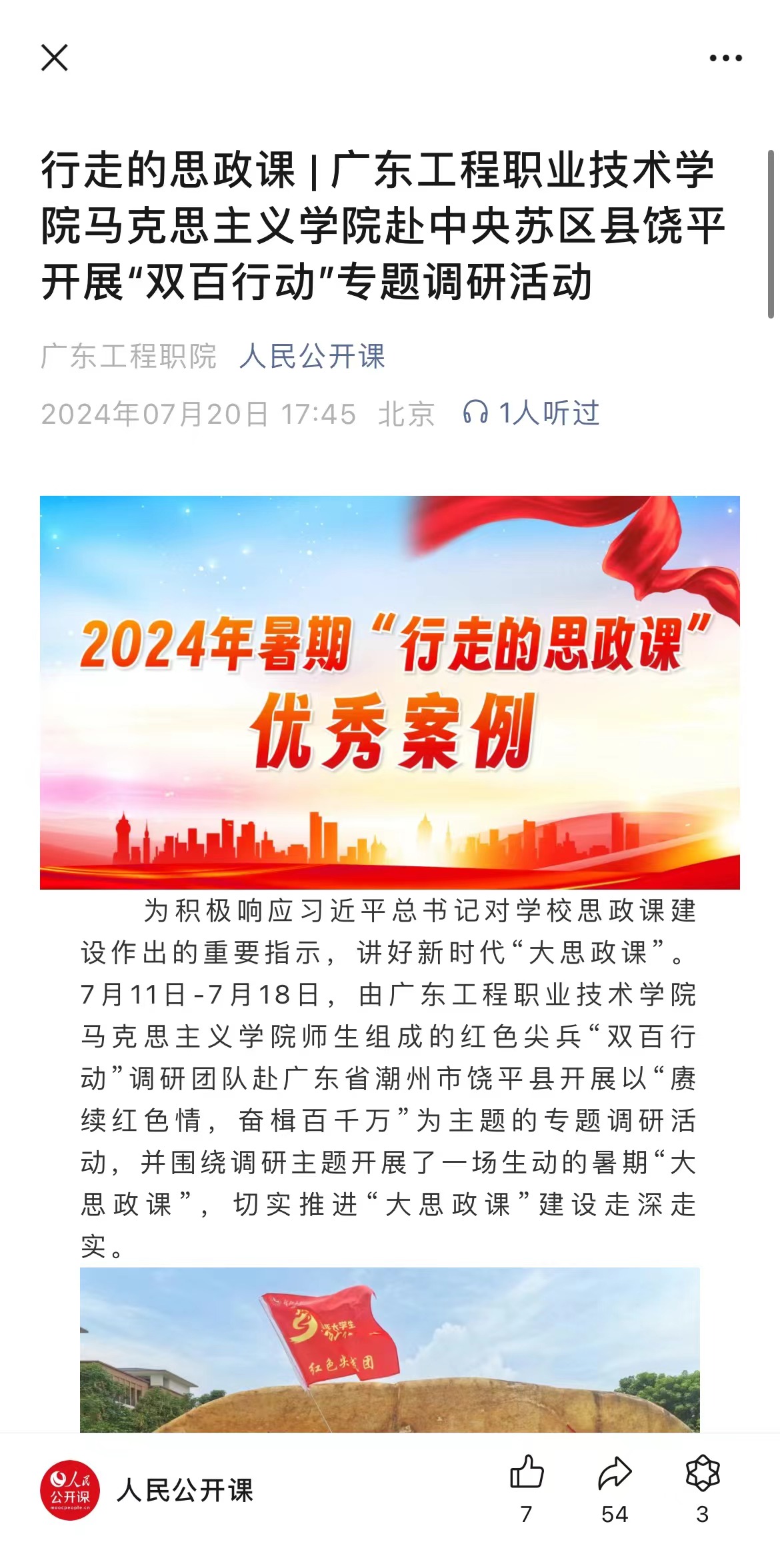 为积极响应习近平总书记对学校思政课建设作出重要指示精神,讲好新时代“大思政课”。7月11—7月18日,由广东工程职业学院马克思主义学院师生组成的红色尖兵“双百行动”调研团队赴广东省潮州市饶平县开展以“赓续红色情,奋楫百千万”为主题的专题调研活动,并围绕调研主题开展了一场生动的暑期“大思政课”,切实推进“大思政课”建设走深走实。
