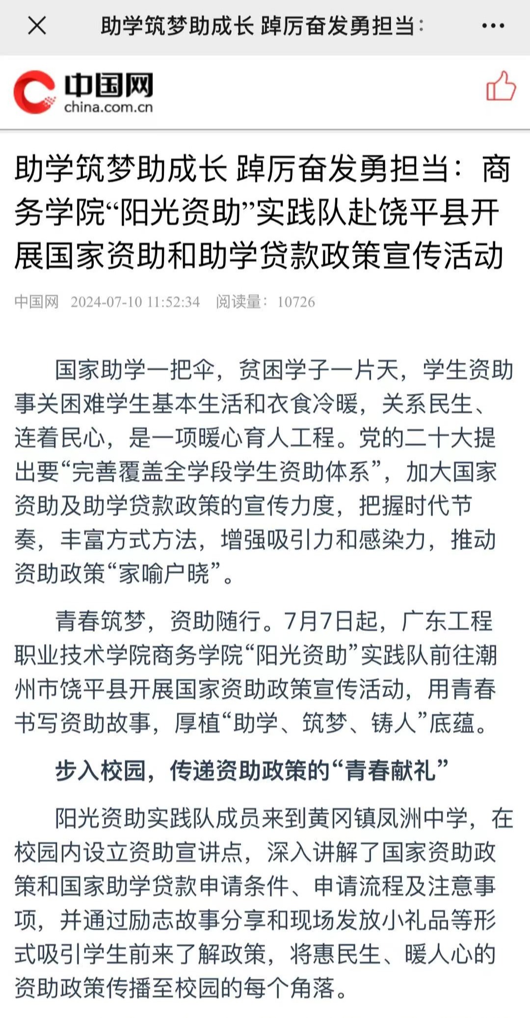 【中国网】:助学筑梦助成长 踔厉奋发勇担当:商务学院“阳光资助”实践队赴饶平县开展国家资助和助学贷款政策宣传活动