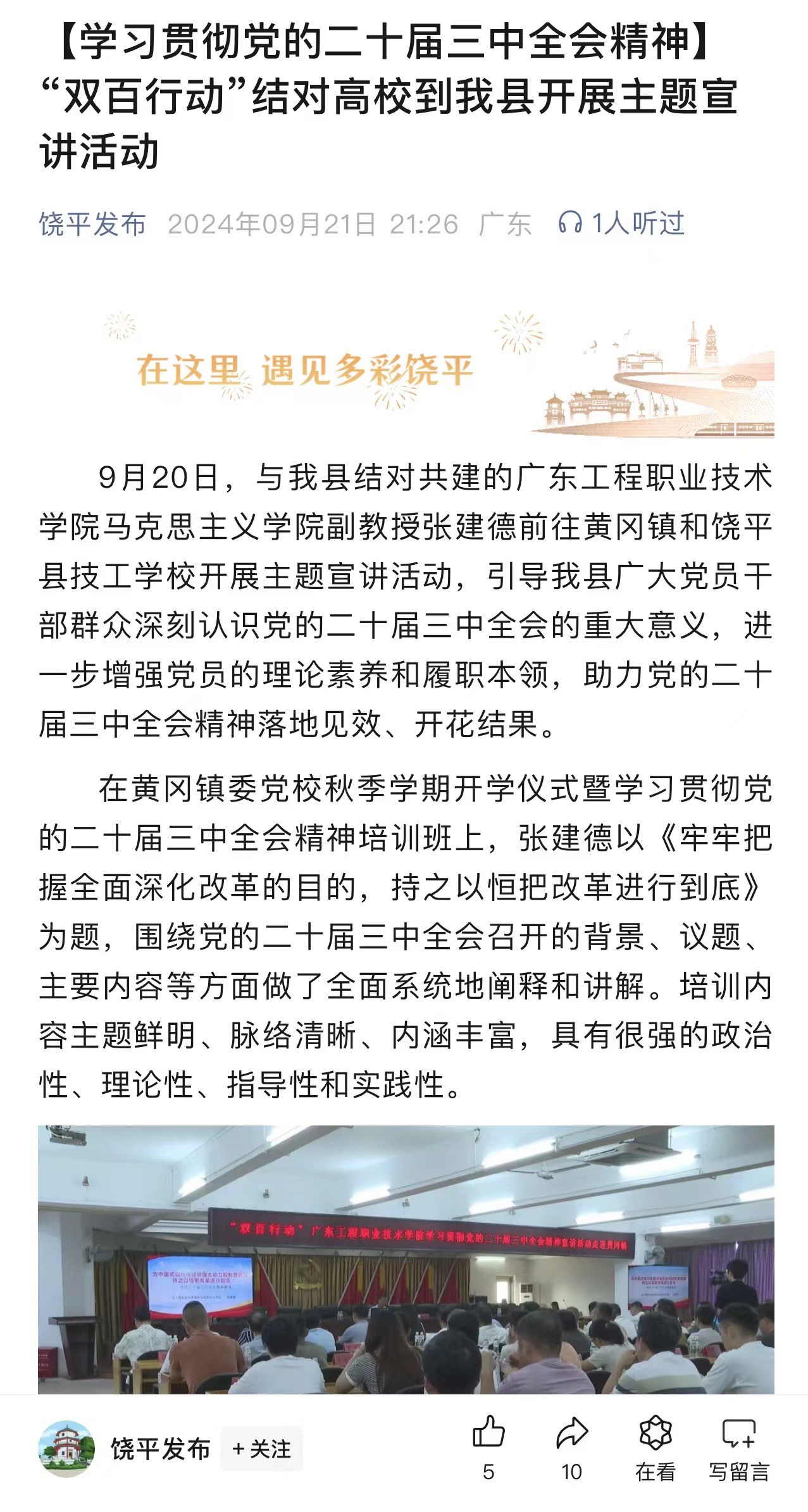 9月20日,与我县结对共建的广东工程职业技术学院马克思主义学院副教授张建德前往黄冈镇和饶平县技工学校开展主题宣讲活动,引导我县广大党员干部群众深刻认识党的二十届三中全会的重大意义,进一步增强党员的理论素养和履职本领,助力党的二十届三中全会精神落地见效、开花结果。
