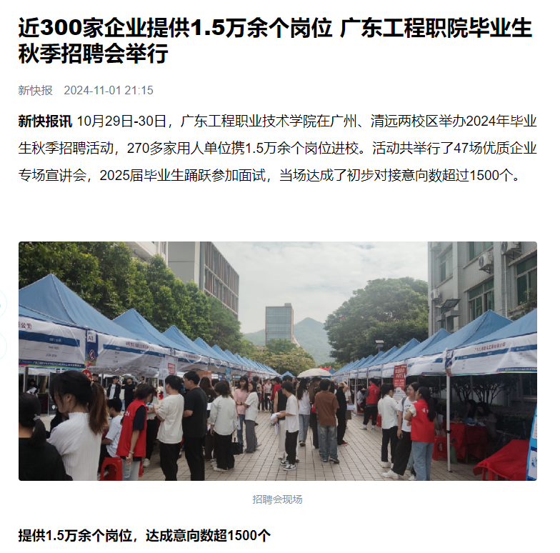 新快报讯10月29日-30日,广东工程职业技术学院在广州、清远两校区举办2024年毕业生秋季招聘活动,270多家用人单位携1.5万余个岗位进校。活动共举行了47场优质企业专场宣讲会,2025届毕业生踊跃参加面试,当场达成了初步对接意向数超过1500个。