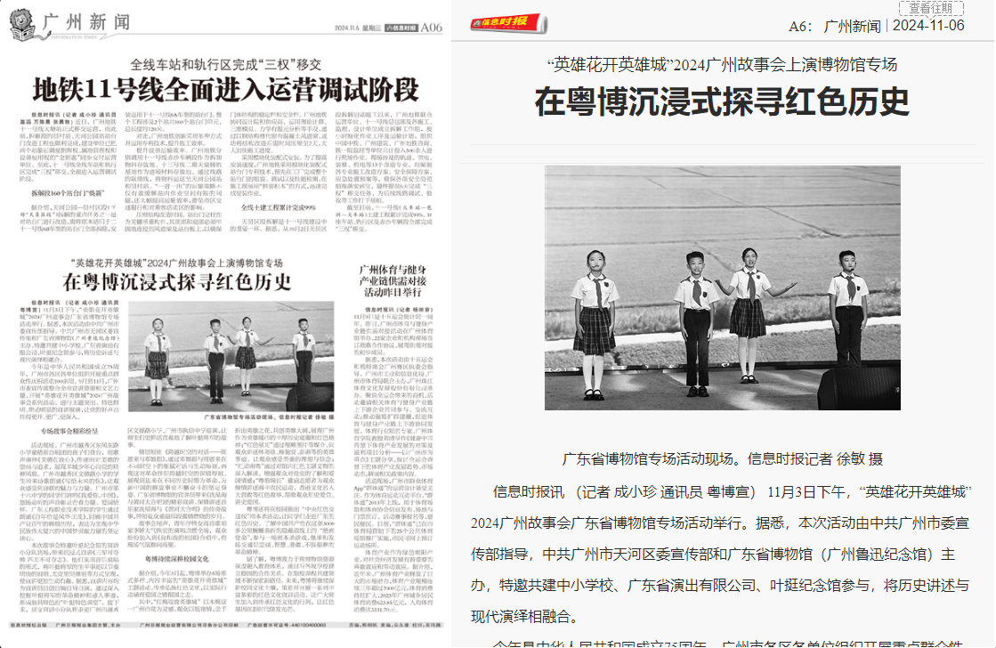 信息时报讯(记者成小珍通讯员粤博宣)11月3日下午,“英雄花开英雄城”2024广州故事会广东省博物馆专场活动举行。据悉,本次活动由中共广州市委宣传部指导,中共广州市天河区委宣传部和广东省博物馆(广州鲁迅纪念馆)主办,特邀共建中小学校、广东省演出有限公司、叶挺纪念馆参与,将历史讲述与现代演绎相融合。