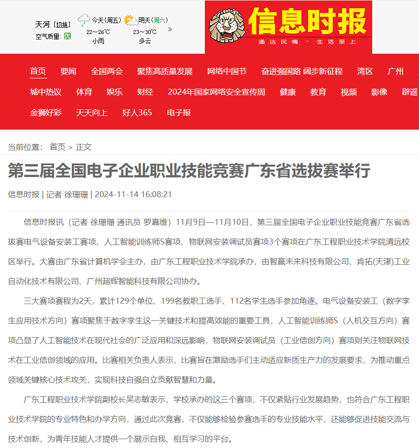 信息时报讯(记者 徐珊珊 通讯员 罗嘉维)11月9日—11月10日,第三届全国电子企业职业技能竞赛广东省选拔赛电气设备安装工赛项、人工智能训练师S赛项、物联网安装调试员赛项3个赛项在广东工程职业技术学院清远校区举行。大赛由广东省计算机学会主办,由广东工程职业技术学院承办,由智赢未来科技有限公司、肯拓(天津)工业自动化技术有限公司、广州超辉智能科技有限公司协办。