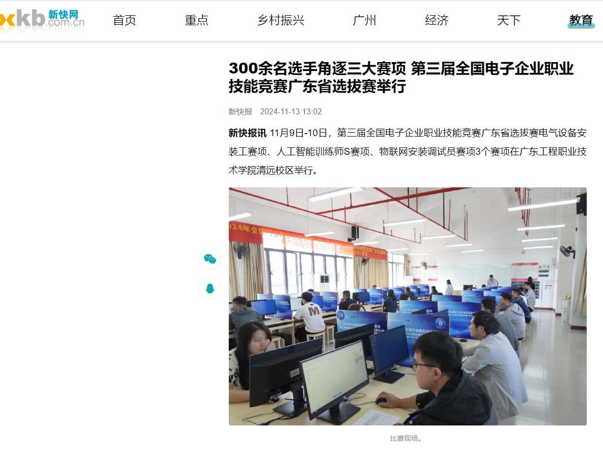 新快报讯11月9日-10日,第三届全国电子企业职业技能竞赛广东省选拔赛电气设备安装工赛项、人工智能训练师S赛项、物联网安装调试员赛项3个赛项在广东工程职业技术学院清远校区举行。