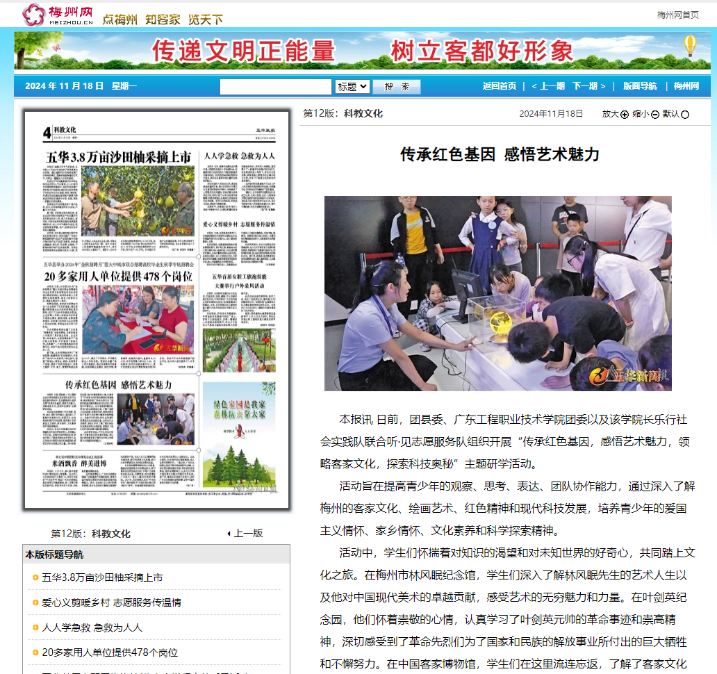 本报讯 日前,团县委、广东工程职业技术学院团委以及该学院长乐行社会实践队联合听·见志愿服务队组织开展“传承红色基因,感悟艺术魅力,领略客家文化,探索科技奥秘”主题研学活动。