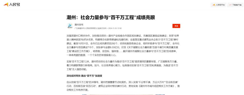 实施“百千万工程”以来,潮州把动员社会力量作为推动“百千万工程”提质增效的重要举措,广泛凝聚各方力量,着力构建群策群力新格局。如今,社会各界凝心聚力,绘就推动实施“百千万工程”的和美画面,为推进“百千万工程”注入强劲动能。