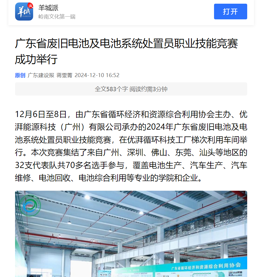 12月6日至8日,由广东省循环经济和资源综合利用协会主办、优湃能源科技(广州)有限公司承办的2024年广东省废旧电池及电池系统处置员职业技能竞赛,在优湃循环科技工厂梯次利用车间举行。本次竞赛集结了来自广州、深圳、佛山、东莞、汕头等地区的32支代表队共70多名选手参与,覆盖电池生产、汽车生产、汽车维修、电池回收、电池综合利用等专业的学院和企业。