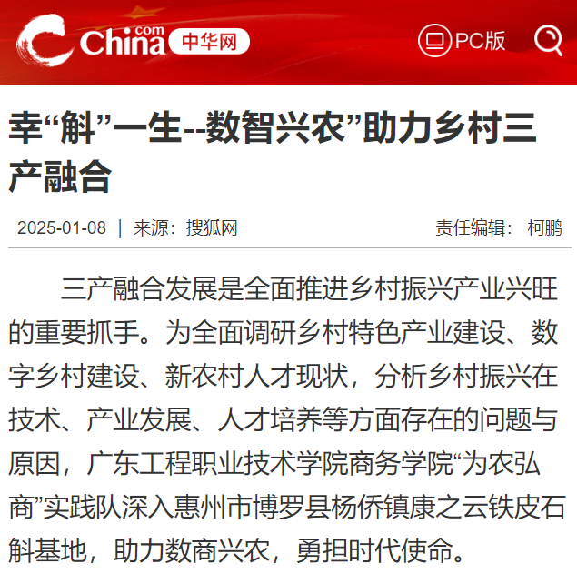 三产融合发展是全面推进乡村振兴产业兴旺的重要抓手。为全面调研乡村特色产业建设、数字乡村建设、新农村人才现状,分析乡村振兴在技术、产业发展、人才培养等方面存在的问题与原因,广东工程职业技术学院商务学院“为农弘商”实践队深入惠州市博罗县杨侨镇康之云铁皮石斛基地,助力数商兴农,勇担时代使命。