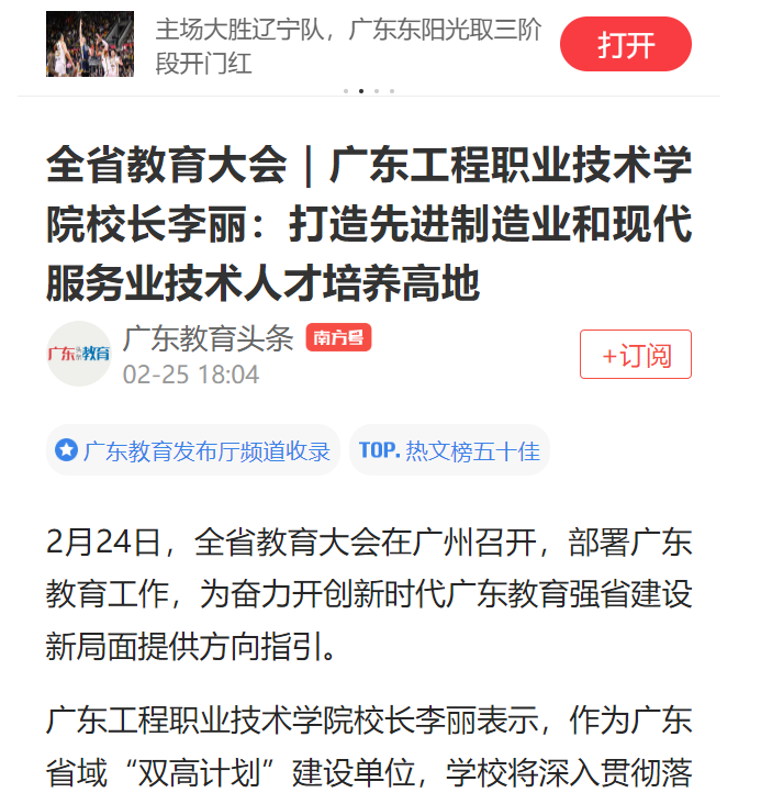 广东工程职业技术学院校长李丽表示,作为广东省域“双高计划”建设单位,学校将深入贯彻落实全省教育大会精神,瞄准粤港澳大湾区建设和广东发展需求,以服务区域产业升级和科技创新为核心,融合“人才链—创新链—产业链”,推进教育、科技、人才“三位一体”改革,为建设教育强省贡献力量。
