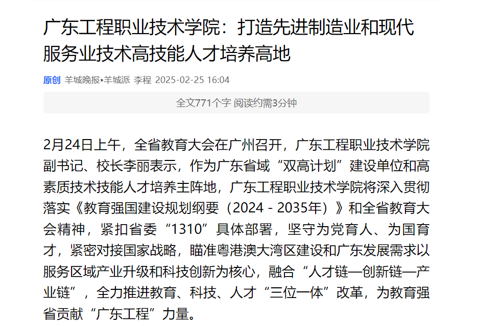 2月24日上午,全省教育大会在广州召开,广东工程职业技术学院副书记、校长李丽表示,作为广东省域“双高计划”建设单位和高素质技术技能人才培养主阵地,广东工程职业技术学院将深入贯彻落实《教育强国建设规划纲要(2024-2035年)》和全省教育大会精神,紧扣省委“1310”具体部署,坚守为党育人、为国育才,紧密对接国家战略,瞄准粤港澳大湾区建设和广东发展需求以服务区域产业升级和科技创新为核心,融合“人才链—创新链—产业链”,全力推进教育、科技、人才“三位一体”改革,为教育强省贡献“广东工程”力量。