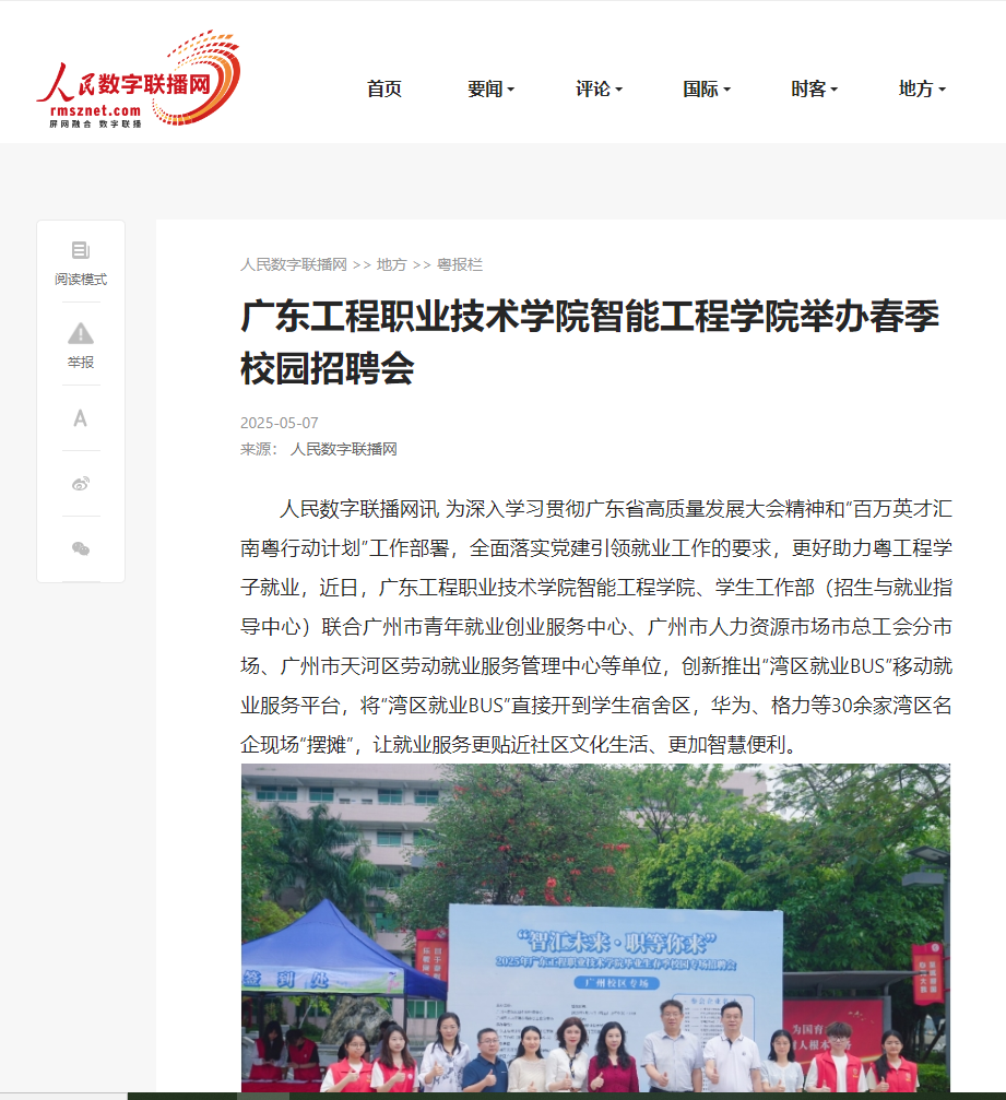 人民数字联播网讯 为深入学习贯彻广东省高质量发展大会精神和“百万英才汇南粤行动计划”工作部署,全面落实党建引领就业工作的要求,更好助力粤工程学子就业,近日,广东工程职业技术学院智能工程学院、学生工作部(招生与就业指导中心)联合广州市青年就业创业服务中心、广州市人力资源市场市总工会分市场、广州市天河区劳动就业服务管理中心等单位,创新推出“湾区就业BUS”移动就业服务平台,将“湾区就业BUS”直接开到学生宿舍区,华为、格力等30余家湾区名企现场“摆摊”,让就业服务更贴近社区文化生活、更加智慧便利。