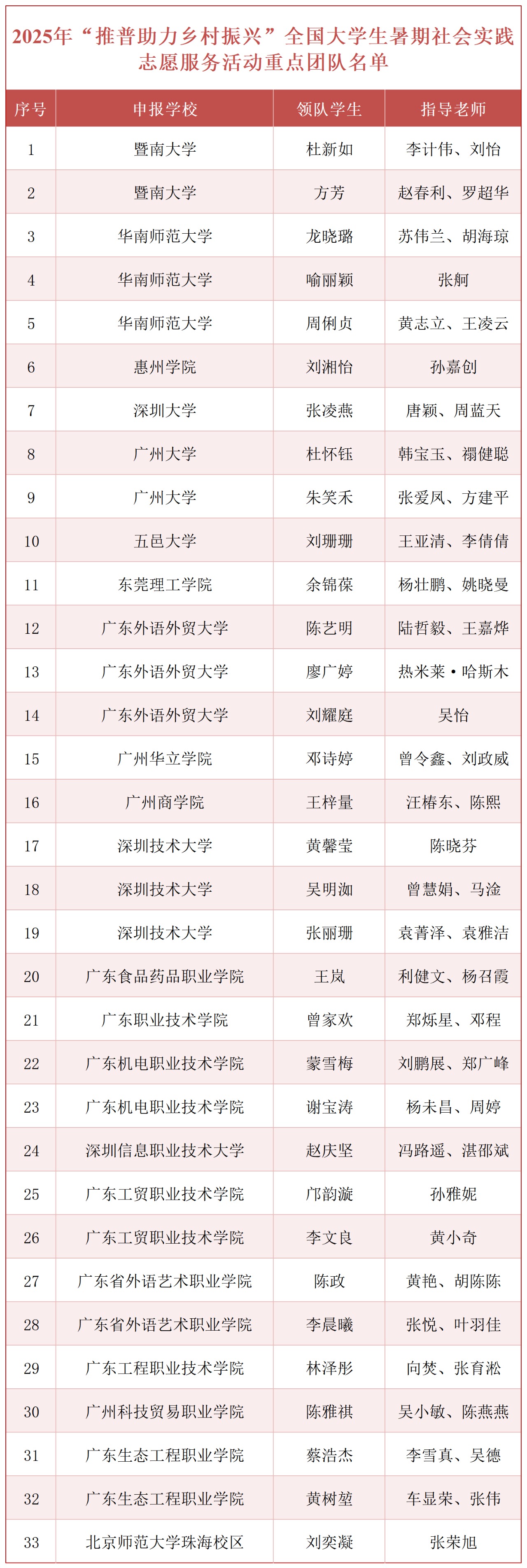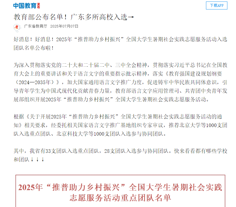 好消息!好消息!2025年“推普助力乡村振兴”全国大学生暑期社会实践志愿服务活动入选团队名单公布啦! 为深入贯彻落实党的二十大和二十届二中、三中全会精神,贯彻落实习近平总书记在全国教育大会上的重要讲话和关于语言文字的重要指示批示精神,落实《教育强国建设规划纲要(2024—2035年)》,加大国家通用语言文字推广力度,促进铸牢中华民族共同体意识,引导青年学生为中国式现代化贡献青春力量,教育部语言文字应用管理司、共青团中央青年发展部组织开展2025年“推普助力乡村振兴”全国大学生暑期社会实践志愿服务活动。 根据《关于开展2025年“推普助力乡村振兴”全国大学生暑期社会实践志愿服务活动的通知》相关要求,经委托相关国家语言文字推广基地组织专家审议,推荐北京大学等1000支团队入选重点团队、北京科技大学等1000支团队入选参与协同团队。