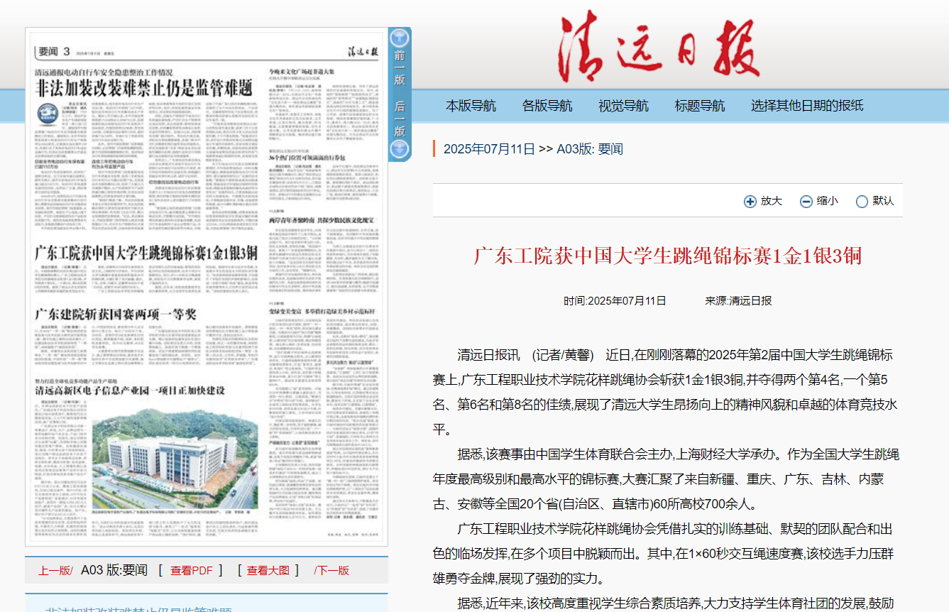 清远日报讯 (记者/黄馨) 近日,在刚刚落幕的2025年第2届中国大学生跳绳锦标赛上,广东工程职业技术学院花样跳绳协会斩获1金1银3铜,并夺得两个第4名,一个第5名、第6名和第8名的佳绩,展现了清远大学生昂扬向上的精神风貌和卓越的体育竞技水平。