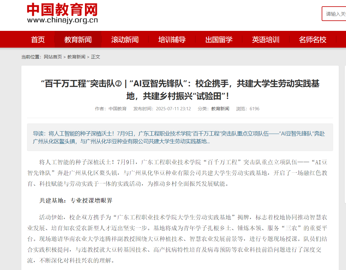 将人工智能的种子深植沃土!7月9日,广东工程职业技术学院“百千万工程”突击队重点立项队伍——“AI豆智先锋队”奔赴广州从化区鳌头镇,与广州从化华豆种业有限公司共建大学生劳动实践基地,开启了一场融红色教育、科技赋能与劳动实践于一体的实践活动,为推动乡村全面振兴发展赋能。