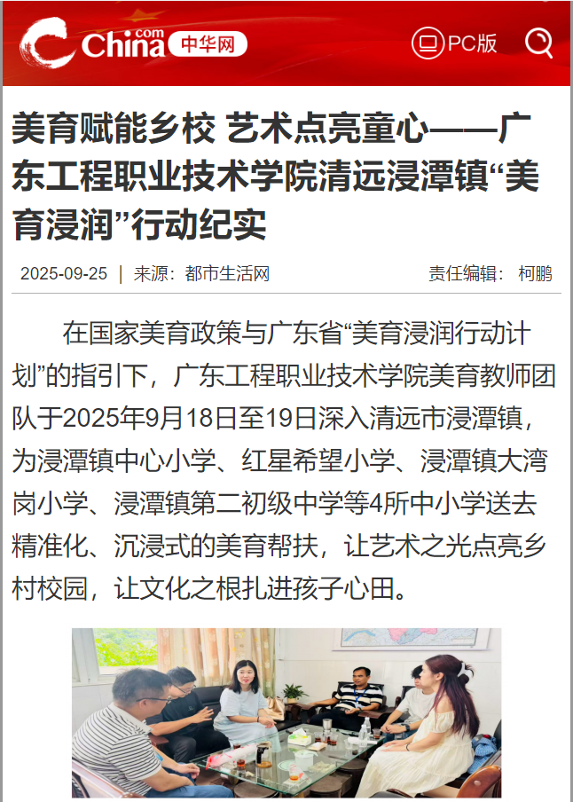 2025年9月25日《中华网》刊发文章《美育赋能乡校 艺术点亮童心——广东工程职业技术学院清远浸潭镇“美育浸润”行动纪实》,报道了我校深入中小学开展美育帮扶行动。