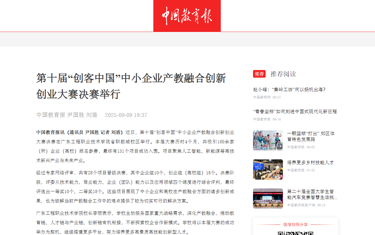 2025年9月9日《中国教育报》刊发文章《第十届“创客中国”中小企业产教融合创新创业大赛决赛举行》,报道了我校举办第十届“创客中国”中小企业产教融合创新创业大赛决赛。