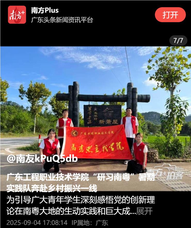 为引导广大青年学生深刻感悟党的创新理论在南粤大地的生动实践和巨大成就,坚定不移听党话、跟党走。近日,广东工程职业技术学院马克思主义学院组织青年学生利用暑期积极投身社会实践,通过所见所闻在南粤大地上感悟思想伟力。
