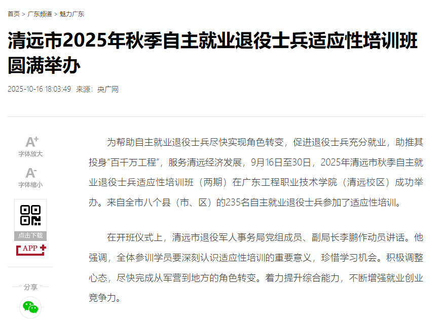为帮助自主就业退役士兵尽快实现角色转变,促进退役士兵充分就业,助推其投身“百千万工程”,服务清远经济发展,9月16日至30日,2025年清远市秋季自主就业退役士兵适应性培训班(两期)在广东工程职业技术学院(清远校区)成功举办。来自全市八个县(市、区)的235名自主就业退役士兵参加了适应性培训。
