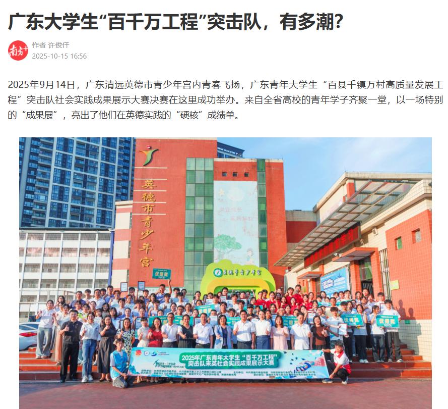 2025年9月14日,广东清远英德市青少年宫内青春飞扬,广东青年大学生“百县千镇万村高质量发展工程”突击队社会实践成果展示大赛决赛在这里成功举办。来自全省高校的青年学子齐聚一堂,以一场特别的“成果展”,亮出了他们在英德实践的“硬核”成绩单。