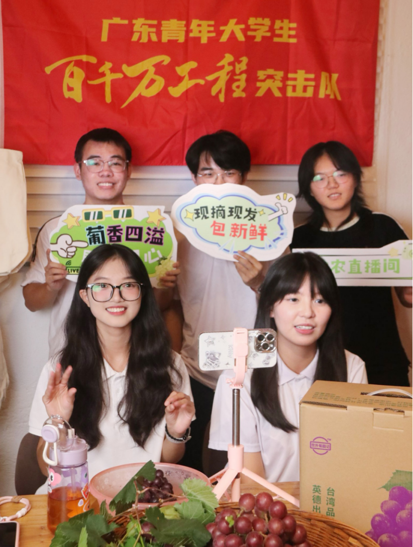 图为广州大学“星火梅寨”突击队在直播销售该市横石塘镇龙华村夏黑葡萄