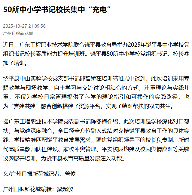 近日,广东工程职业技术学院联合饶平县教育局举办2025年饶平县中小学校党组织书记校长素质能力提升培训班。饶平县50所中小学校党组织书记、校长参加了培训。