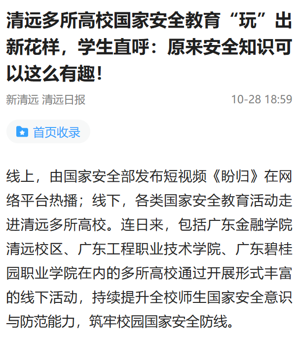 线上,由国家安全部发布短视频《盼归》在网络平台热播;线下,各类国家安全教育活动走进清远多所高校。连日来,包括广东金融学院清远校区、广东工程职业技术学院、广东碧桂园职业学院在内的多所高校通过开展形式丰富的线下活动,持续提升全校师生国家安全意识与防范能力,筑牢校园国家安全防线。