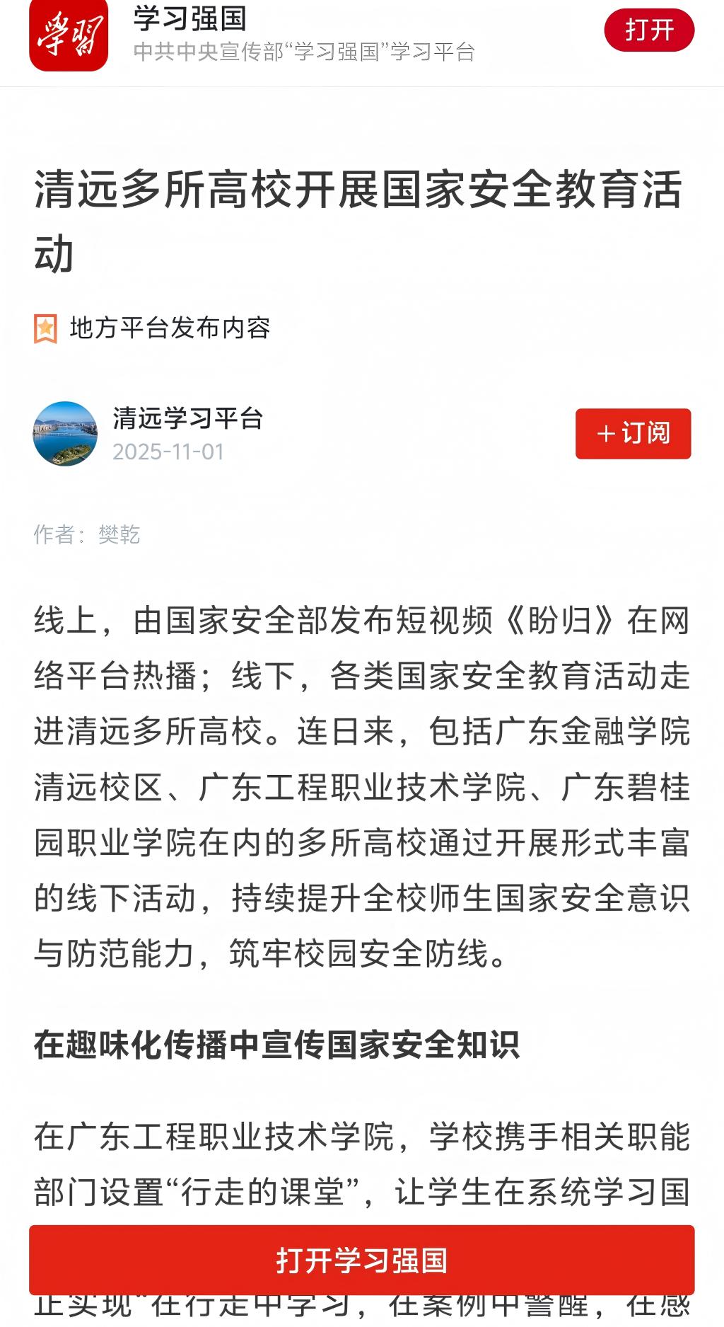 线上,由国家安全部发布短视频《盼归》在网络平台热播;线下,各类国家安全教育活动走进清远多所高校。连日来,包括广东金融学院清远校区、广东工程职业技术学院、广东碧桂园职业学院在内的多所高校通过开展形式丰富的线下活动,持续提升全校师生国家安全意识与防范能力,筑牢校园安全防线。