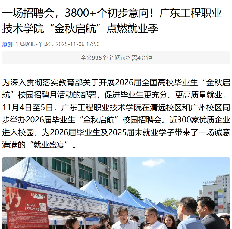 未来,广东工程职业技术学院还将持续深化与各类用人单位的长期战略合作,着力打造高效便捷的“就业直通车”,为毕业生提供更丰富、更优质的就业岗位,全力推动2026届毕业生实现更加充分、更高质量的就业目标。